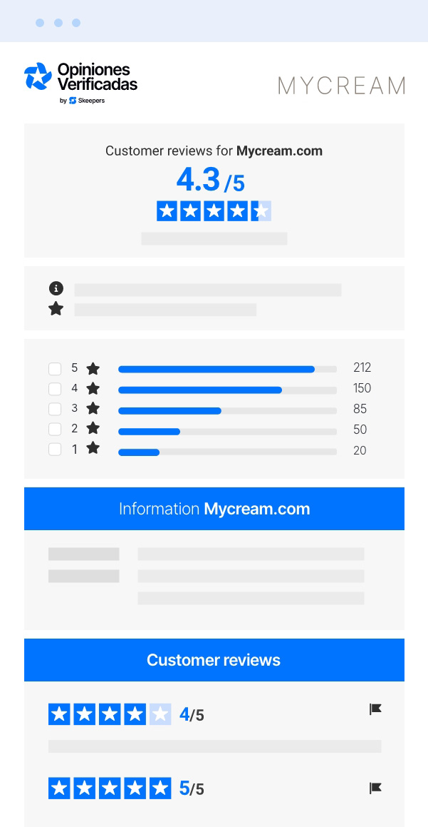 Comparte las reseñas de tus clientes a gran escala y aprovecha las ventajas de la insignia Opiniones Verificadas. Activa las reseñas en todos los canales online (sitio web, plataformas de revisión de terceros, redes sociales, etc.) y offline (anuncios de televisión, puntos de venta, publicidad, etc.). ¡Las posibilidades son infinitas!